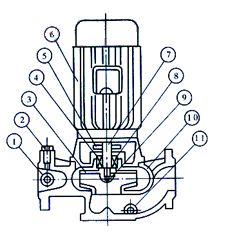 | 1 | 取 压 塞 | 7 | 轴 | 2 | 排 气 阀 | 8 | 联 体 座 | 3 | 叶 轮 | 9 | 叶轮螺母 | 4 | 机械密封 | 10 | 泵 体 | 5 | 挡 水 圈 | 11 | 放 水 阀 | 6 | 电 机 | | |