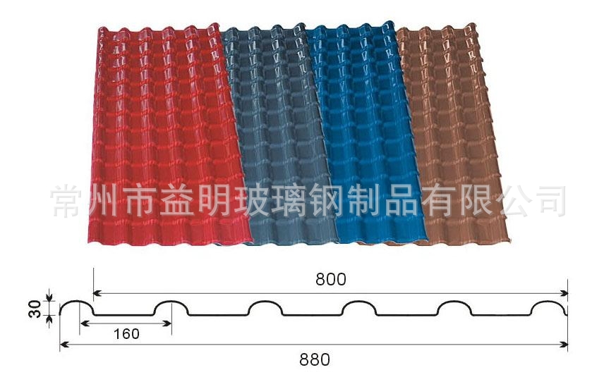 益明合成树脂瓦外观尺寸瓦: 厚度:(3.0±0.2)mm 宽度:(880±10)mm 重量:(6.0±0.1)kg/㎡ 长度:根据施工要求 正脊瓦:厚度:3.0±0.1 长度:880±10.0 有效长度800 斜脊瓦:厚度:3.0±0.1 长度:880±10.0 有效长度800 三通瓦:厚度:3.0±0.1 长度:280+200×2 瓦头:厚度:3.0±0.1 长度:880±10.0 配件:自攻钉、保护垫、防水帽 配有各种配瓦插图产品特性:1. 超强的耐候性、色彩持久益明合成树脂瓦选用进口超高耐候性工程树脂材料(如ASA,PPMA,PMMA等)作为瓦的表面材料,这种超高耐候性树脂在自然环境中具有超乎寻常的耐久性。它即使长期暴露于紫外线、强光、潮湿、寒热等恶劣环境下,仍能保持其颜色和物理性能的稳定性。经实验检测证明,益明合成树脂瓦可以确保十五年△E值小于5。 益明合成树脂瓦已在国家化学建筑材料测试中心通过了10000小时的人工老化测试,检测结果△E=3.86。(根据太阳照射量和年日照时间,10000小时检测试验相当于自然使用28年)。2.隔音效果好通过音位测定试验表明,在遭受暴雨、冰雹、大风等外界噪音影响时,益明合成树脂瓦能很好的吸收噪音和减少噪音的穿过,免受噪音之扰。3.保温隔热效果好益明合成树脂瓦的导热系数为0.325W/m.k,是粘土瓦的1/30,厚水泥瓦的1/5,0.5mm厚彩钢瓦的1/2000。在不考虑加保温层的情况下,益明合成树脂瓦的隔热保温性能最佳。4.耐低温、抗冲击益明合成树脂瓦在低温(-40℃)冻融循环下,经落球冲击试验,1公斤重钢球1米高自由落下,无碎裂现象;在常温下(23±2℃)经落球冲击试验,1公斤重钢球3米高自由落下,在瓦的表面上不会产生裂纹或贯穿洞。5.优异的耐腐蚀性能益明合成树脂瓦主体树脂和表面树脂都具有非常好的耐腐蚀性能,不会被雨雪侵蚀,并可长期抵御酸、碱、盐等多种化学物质的侵蚀。实验表明,在40%NaOH、40%H2SO4溶液中,浸渍24小时,产品不会变形或变色。各种微生物也无法在瓦的表面生存。6.卓越的自防水性能益明合成树脂瓦所选用的高耐候树脂本身致密且不吸水,不存在微孔渗水的问题。树脂瓦单张面积大,屋面接缝少,且搭接处结合严密,与传统小块瓦相比防水性能更加突出。7.体积稳定益明合成树脂瓦的膨胀系数为4.93×10﹣5/℃,加之瓦型在几何形状上具有双向拉伸性能,即使温度变化很大,瓦的伸缩也能被自身消化,确保瓦的几何尺寸不变。8.耐火性强益明合成树脂瓦主体材料聚氯乙烯树脂自身属于难燃材料,经国家防火部门检测防火性能达到B1级。9.绝缘益明合成树脂瓦是绝缘材料,遇到意外放电也会完好无损。10.质轻益明合成树脂瓦属于轻体结构材料,重量(6.0±0.2)kg/m2,有效的减轻了建筑物的负荷,提高了安全性,非常适宜于旧楼改造。同时便于搬运和施工,节省运费,降低施工成本。11.自清洁性能益明合成树脂瓦本身光滑致密,不易吸附灰尘,一经雨水冲刷便洁净如新,不会出现积垢现象。12.安装便捷益明合成树脂瓦单张面积大,铺装效率高,工序简单,配套产品齐全,安装快捷省工省时。
