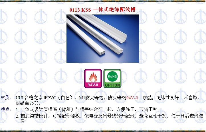 我司是专营KSS的配线器材目前产品有几万种[如;扎带、配线槽、浪管、固定头等]行销世界百于国,是亚洲最大的专业配线器材配套商,在电力、电子、机械、家具等工业领域深受信赖,现在阿里巴巴推出我们的形象产品KSS 配线槽系列,可为企业提供专业的产品配套,可为经销行业人士提供产品批发,我们以品质为保证,以服务求发展,期待与您的合作。
