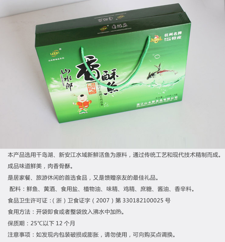 本品选用千岛湖鲜活野生鱼为原料,通过传统与现代工艺相结合秘制而成。内包装采用复合真空包装,杜绝了二次污染,方便储藏携带。加工进程绝不添加任何防腐剂和添加剂,生态、营养、健康。