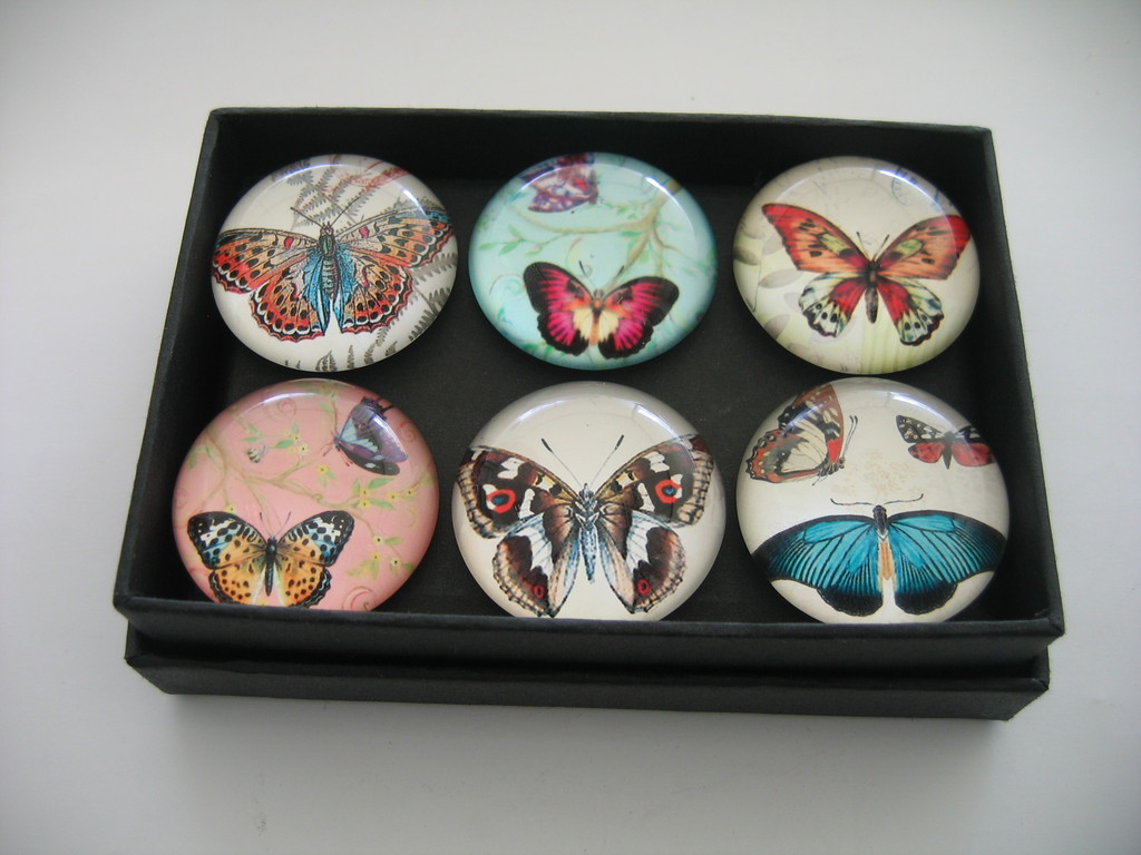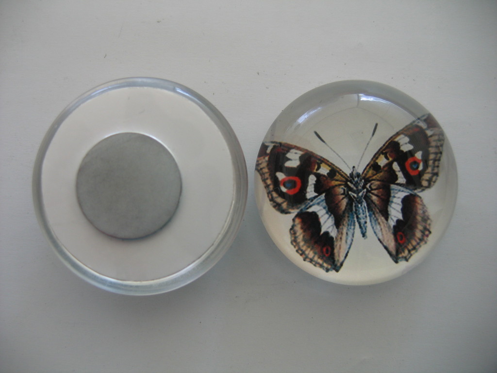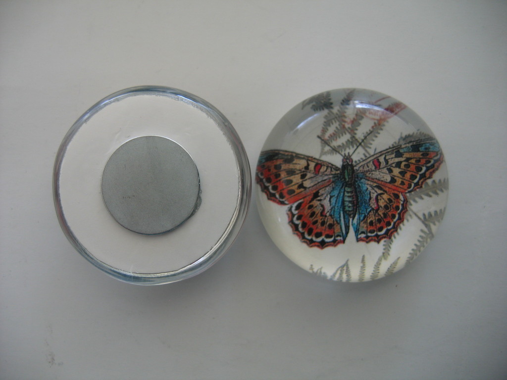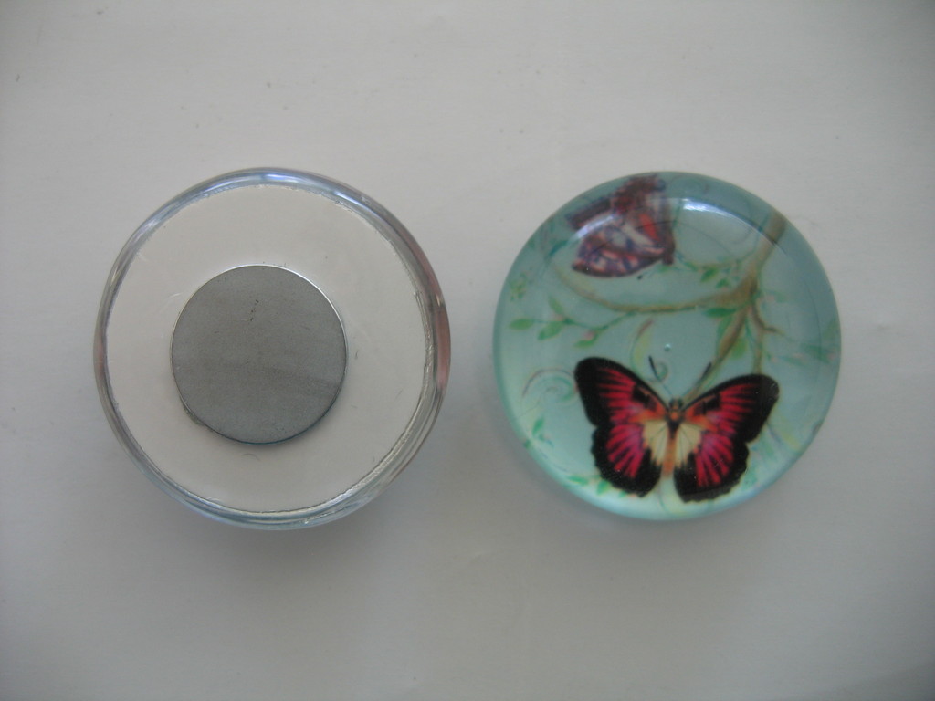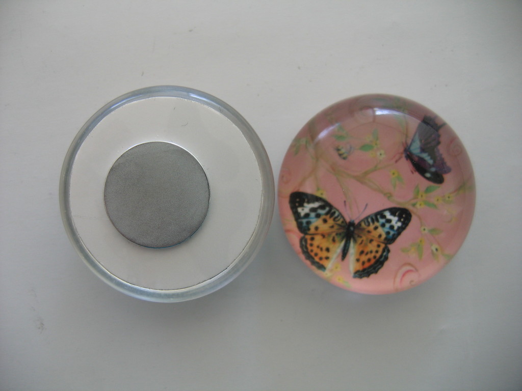 11)玻璃冰箱贴:采用下面软磁+表面铜版纸彩色印刷+PP复膜+半圆玻璃珠制作而成