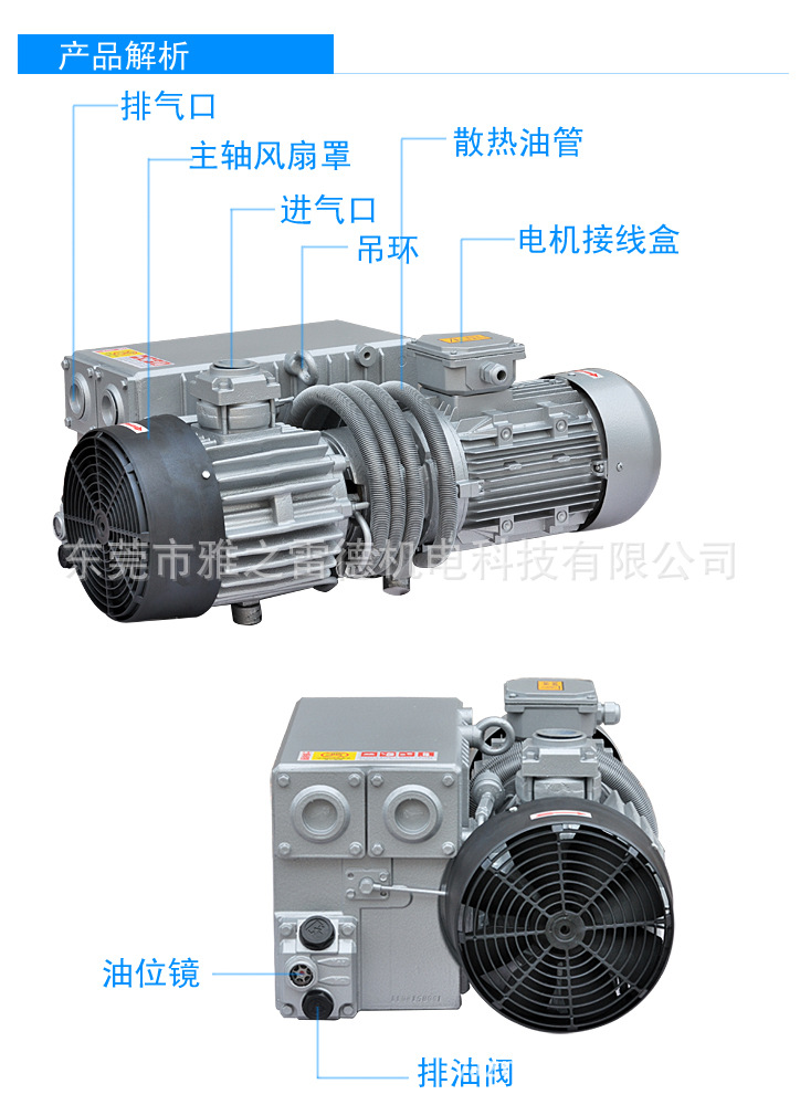 2 、舒适环境:根据空气冷却,在吸入口内安装设备,低噪音、低震动,不使用润滑油的同时可以得到稳定的真空及排气压力,无论在任何场所都可以使用。