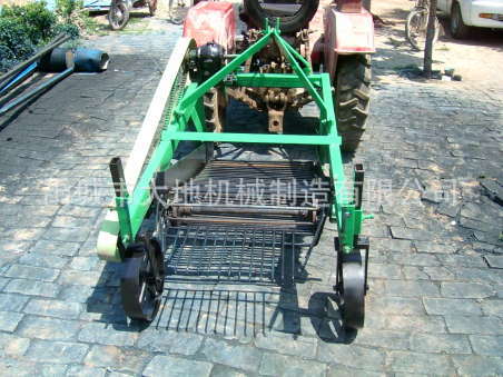 该收获机可收获:土豆、地瓜等根茎类作物,有割秧机构、地轮、挖掘铲、输送链、清选筛等部件组成,可一次完成割秧、挖掘、筛选等工序,分为中间传动和左侧传动两种,以适配不同手扶拖拉机。