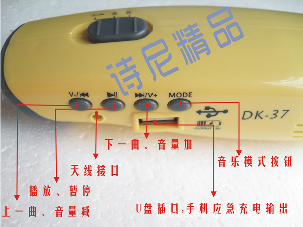 4、当使用音乐播放时,请打开电源开关,可以按音乐模式选择U