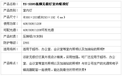 压铸铝电气箱,表面静电喷塑处理,耐腐,坚久耐用。 与本公司生产的无极灯电子镇流器配套使用,具有功率因数高、寿命长、光输出稳定等特点。 耐高温高强度防紫外线PC罩,具有显色性好、光线柔和、舒适、无闪烁、光色自然等特点,外形简洁精致,易于拆卸,非常美观。