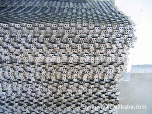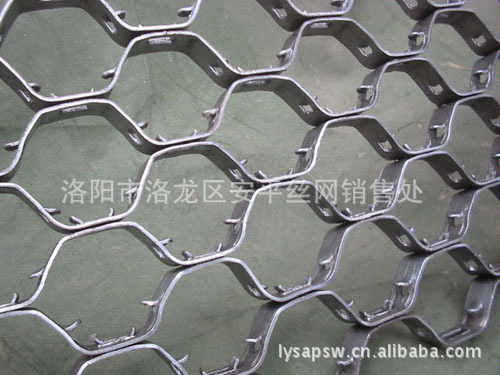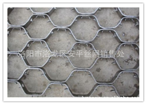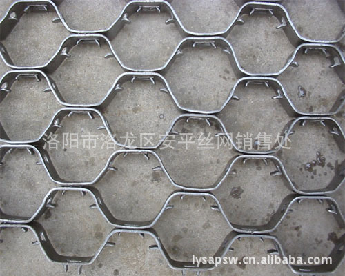 网片大小,由购方自定各种规格加工定做,已有多家主机厂配套合作生产各种金属配件、已为多家石化设备制造企业配套供应各种衬里金属结构件,所生产的产品广泛应用于石油化工大型装置,特别是有利于催化剂化装置主要设备的衬里结构的主要配件之一,它能够提高衬里的耐磨性能和强度,耐磨衬里都用龟甲网加固,一般部位用碳钢(A3F)龟甲网、如反应器及一、二级旋风分离器、U型管再生器烟道等处, 高温部位用合金(1Cr13)龟甲网,如再生器及一、二级旋风分离器等处。龟甲网为20*17.5毫米的扁钢带冲成的六角形格,固定在保温钉端板上。