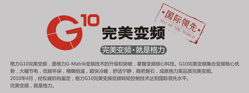 | 格力G10变频,是格力G-Matrik变频技术的升级和突破,掌握变频核心科技。G10变频集合变频核心优势,大幅节电,低碳环保,精确恒温,超快冷暖,舒适宁静,稳若磐石,成就格力高品质变频。2010年4月,经权威机构鉴定,格力G10变频低频转矩控制技术达到国际领先水平。变频,就是格力。 |