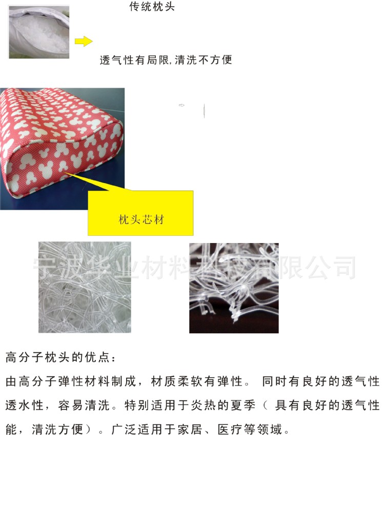 本公司引进国外先进设备,生产最新型高弹性体枕头、床垫内芯。本产品相比较与其它枕头、床垫内芯,新型高弹性体内芯具备无可比拟的优点,尤其适用于医院、学校、部队和工矿等场所的使用需求,目前世界上只有2-3家公司能够生产,该产品在欧、美、日、韩等国家已被广泛使用。