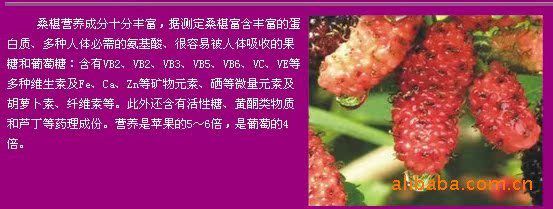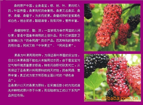 产自北纬31度,陕西安康秦巴万亩生态桑果种植基地。四季分明,雨量充沛,无霜期长。因特殊的生长环境使桑果具有天然生长,无任何污染的特点,所以桑葚享有“民间圣果”之美誉。风味独特,极富营养。每天一杯可以令您获得意外的收获。