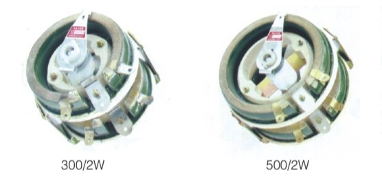 BC系列旋臂滑线式瓷盘变阻器适用于电压不超过500伏的工业电气设备中作电压、电流调节和交直流发电机电压调整及直流电动机转速调节之用。变阻器采用康铜线或镍铬线作为电阻材料绕于圆形陶瓷器骨架上,电阻材料除滑动接触表面外均涂以耐高温珐琅涂料并粘合于陶瓷器底盘上,中心配以转轴带动刷握和电刷的滑动从而获得变化的电阻值。变阻器分开启式及保护式二种,其保护式即变阻器加金属防护箱壳,并配以调节手轮。