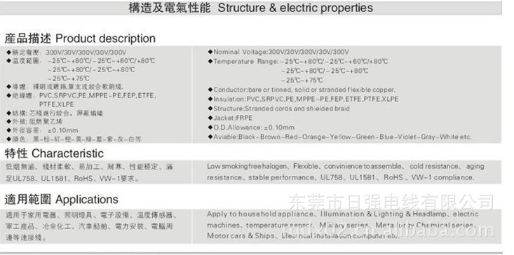 日强电线有限公司应广大用户的需求不惜代价引进最先进的设备技术,致力提供创新专业的电线产品。日强电线坐落于风景秀丽的石碣镇,交通便利,主要制造销售硅胶电线、硅胶并排线、硅胶多芯线、硅胶屏蔽线、硅胶多股软线、硅胶+铁氟龙电源线、铁氟龙电线、氟塑线、特殊规格线可根据客户要求量身订做,UL3239 UL3122 UL3304 PSE3320 CCC245IECO3(YG)PSE等. UL1330 UL1331 UL1332 UL1726 UL10362 UL1709 UL1710 UL1727 UL1887 VDE8219 VDE8220 VDE铁氟龙VDE铁氟龙双绝缘,VDE HO5SJ-K VDE HO5S-K VDE HO5SS-FVDE HO3VV-F-2C HO5VV-F-3C H35VV-H2-F-2C H55VVH2-F-2C H55VVH2-F-3C HO5VV-F4C HO5VV-F5C HO5VVH2-F并通过UL、CUL、CSA、VDE、PSE、CCC等国际认证,并符合ROHS、REACH、低烟无卤标准,产品广泛用于家用电器、暖房器具、吹饮器具、空调机器、照明灯具、电子设备、电热制品、电脑通信、航太、汽车等高科技工业产品。日强电线产品规格齐全、性能优异广泛销售国内、外市场受广大客户好评,欢迎广大客户来电咨询。