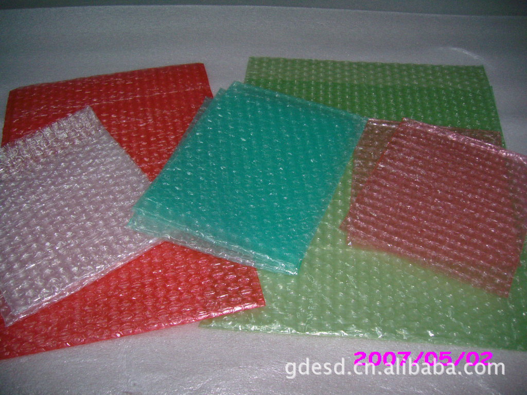 气泡膜是一种绿色环保的新型防震缓冲材料。又俗称气泡纸、气垫膜、气垫薄膜等。产品颜色通常为白色,宽幅可达1800mm,长度不限。气泡直径有3mm、5mm、10mm等。根据膜层结构的不同,可分为单面膜、双面膜等几种。单面汽泡袋适宜保护自身重量较轻的产品,双面汽泡袋防震力强适合体级较大重量级之包装。 生产时对原材料经过特殊处理,可加工成防静电气泡膜,标志颜色为粉红色,其表面电阻值通常在109-1011Ω之间(标准环境)防静电气泡袋适宜于具有一般防静电要求的电子产品的包装。