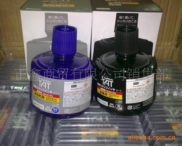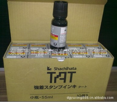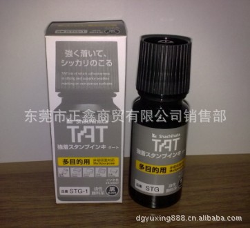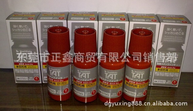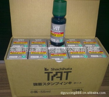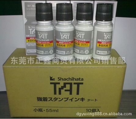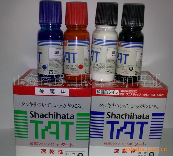 使用指数:★★★☆性价比: ★★★☆★品名:SHACHIHATA旗牌TAT万能不灭印油 ★产地:日本★型号:STSG(通用型快干印油)、STSM(金属用快干印油)、STSP(塑料用快干印油)★规格:型号-1为55ML/瓶,型号-3为330ML/瓶★包装:12瓶/小盒(55ML小瓶装),1瓶/盒(330ML大瓶装)★颜色:红、黑、蓝、白、绿★使用方法:挤印油少量多次均匀涂刷于万能不灭印台表面 ★使用范围:用于金属、塑胶、皮革、非吸墨性纸张、光面纸、亚克力、PVC、布、木材、玻璃、陶瓷、精细电子元件表面,覆塑膜的包装盒、塑料袋等非吸收性表面盖印。作商品批号、检验、出厂日期、有效期限等标识印字。★优点:①性价比较高(印迹不易擦掉,比利百代,狮牌印油效果稍好,但价格较高)②印迹清晰不褪色(耐水洗,耐摩擦,耐低度酒精清洗)③环保(本产品对应RoHS指令合格,附最新SGS环保报告,无卤素报告,品质可靠)④墨干速度快,适用于流水作业☆ 缺点:①不耐酒精(耐低度酒精),不耐高温。溶剂可能造成印油脱落,溶解。②白色印油浓度高,会形成空心字。③印油本身挥发快,使用过程中要注意适量取用,切勿造成浪费。(需使用万能不灭印台,可选用旗牌原装万能不灭印台ATMU-2等,也可选用我公司改装的不灭印台)