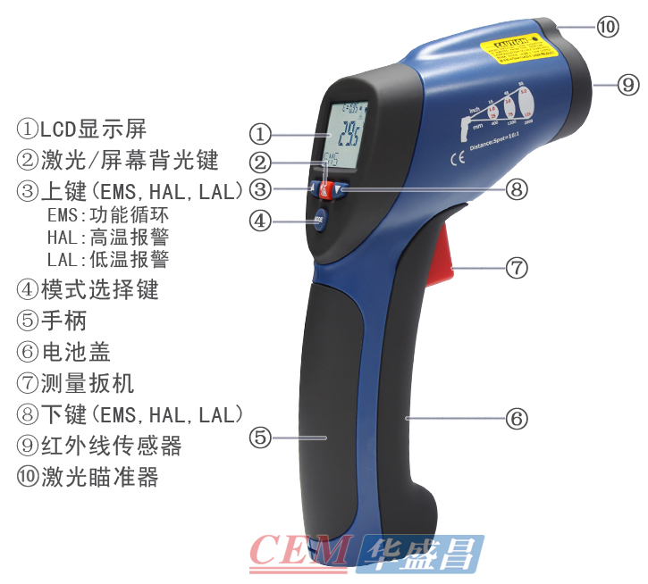 本产品是一款工业高温专业型的手持式非接触式红外测温仪,使用简易,设计坚实,测量准确度高,测温量程范围宽等特点,它具有激光瞄准,带背光源显示器,最大值,最小值,平均值,差值,数据保持,高低温报警,发射率可调及自动关机功能。