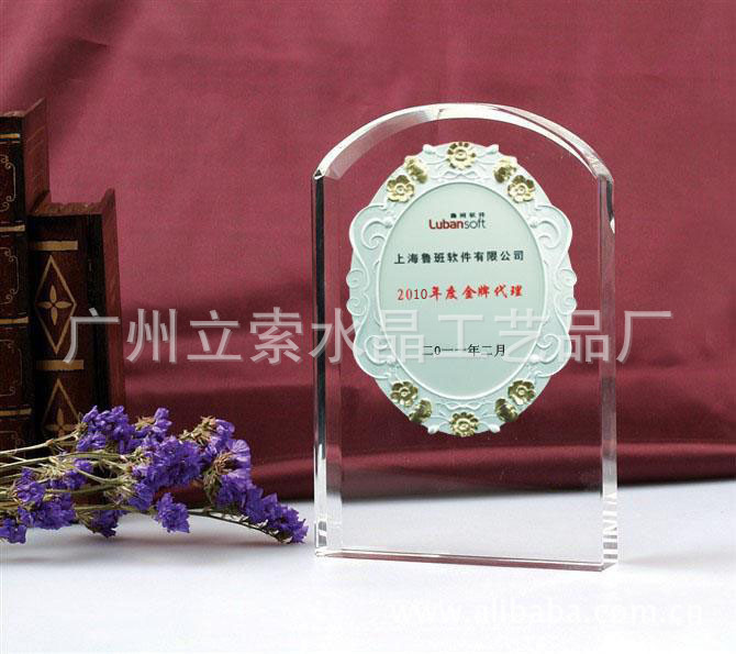 水晶:是一种高尚纯洁的象征,常用于政府和企业颁发的奖品、礼品与礼物。它晶莹剔透,闪闪发光,手感细腻,还可以在上面刻字、纹图案。用的材料水晶---像冰雪一样的干净。用它来做奖品、礼品、礼物颁发、送赠员工、好友是最好不过了。