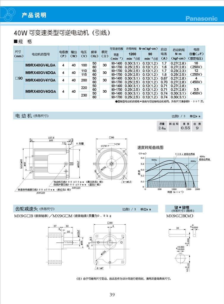 三、电磁刹车马达能短时间内刹车,在无负载时起程为2~4转内刹车,发挥安全的刹车性能。 四、变速马达 配合速度控制器可调速范围广:90~1400RPM,内部备有转速传感器,实行反馈控制,因此电源频率有变化,其规定转数决无变化。五、UL规格马达CE规格马达 CCC规格马达电源规格60Hz115V,50/60Hz100V,有内装防止过热装置的马达和保护阻抗的马达两种均获UL规格批准 系列:G系列功率:3W,6W,15W,25W,40W,60W,90W 速比:3,3.6,5,6,7.5,9,10,12.5,15,18,20,25,30,36,50,60,75,90,100,120,150,180,200,10X 压:L=100V,Q=110V,Y=200V,W=220V,G=230,CE=380V M4:42mm,M6:60mm,M7:70mm,M8:80mm,M9:90mm 1X:40W以下连续运转,1Z:60-90W连续运转 RX:40W以下可逆式,RZ:60-90W可逆,MX:25-40W三相,MZ:60-90W三相, S:圆轴,G:斜齿轴,GV:调速,GB:制动。
