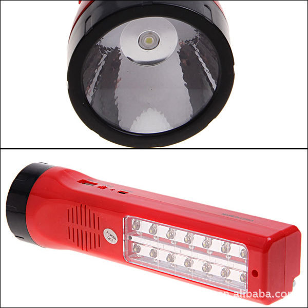 LED手电音箱:1W大灯+14小灯, 可插U盘、TF卡、带FM 内置电池900MA