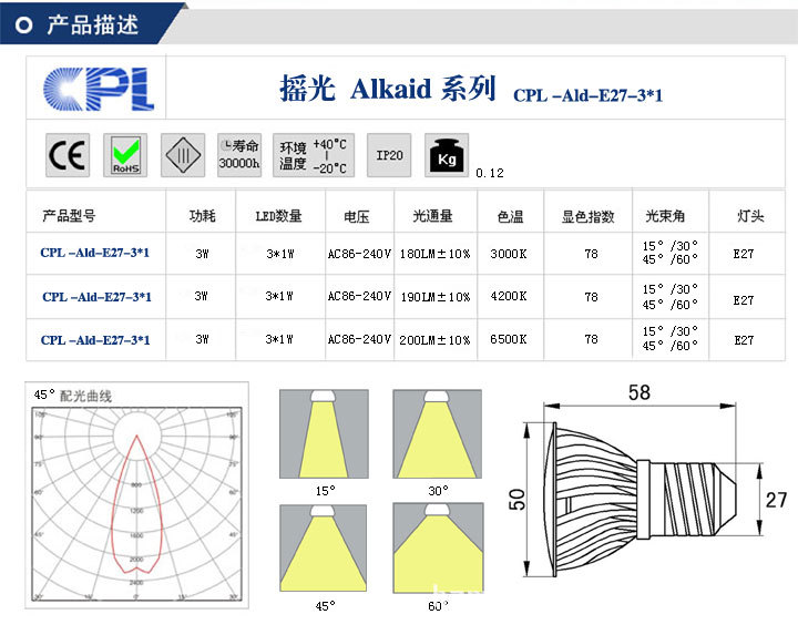 LED射灯灯杯主要品牌CPL灯杯直销 压铸铝3w高亮e27可调聚光射灯