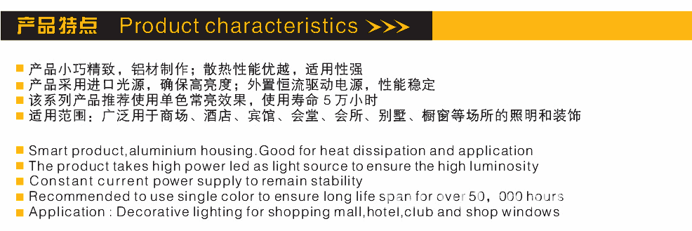 产品采用进口光源确保高亮度;外置恒流驱动电源,性能稳定该系列产品推荐使用单色常量效果使用寿命5万小时使用范围:广泛用于商场,酒店,宾馆,会堂,会所,别墅,橱窗等场所的照明和装饰