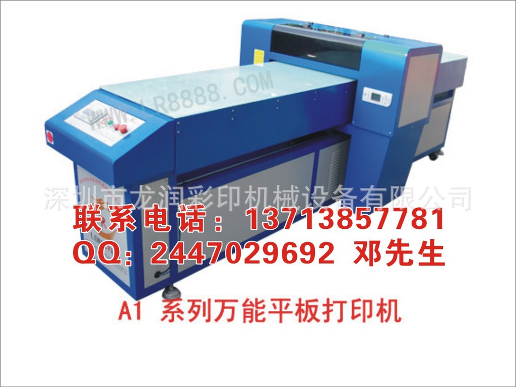 专业生产万能平板打印机,又称万能打印机,可打印各类金属,陶瓷,水晶,有机玻璃,压克力,PVC,PE,胶片,不锈钢,铜板纸,塑料,硅胶,木制品,无纺布,皮革,布料,石材,玩具,光盘,U盘等各种素材物体、软性物体、硬性物体。一次成像,直接把彩色图案、LOGO、文字喷印在产品表面,无需制版,出菲林,晒网拉版。成本底,效果好,投资少!回报快!效率高!质量保证的设备!
