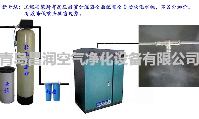 进口柱塞泵将净化处理的洁净加压至7Mpa后在经耐高压管传送至特制的喷头喷出,喷出的水雾与空气进行热湿交换而使喷出的水雾汽化由此起到加湿空气的目的。这种加湿方式属于等焓加湿方式,在加湿的同时亦能起到一定的降温作用。它具有节能、安全、可靠等优点具有很高的性能价格比。