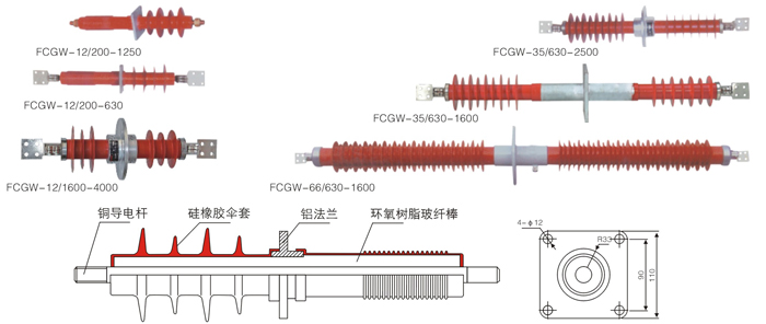 | 规格型号 | 额定电压 (kV) | 额定电流 A | 总长度(mm) | 户内终端 长度(mm) | 户外终端 长度(mm) | 户内绝缘 距离(mm) | 户外绝缘 距离(mm) | 户内爬电 距离(mm) | 户外爬电 距离(mm) | | FCGW-12/200~1250 | 12 | 200~1250 | 530 | 235 | 205 | 235 | 205 | 280 | 400 | | FCGW-12/250~1000 | 10 | 250~1000 | 540 | 280 | 240 | 240 | 410 | 280 | 380 | | FCGW-12/1600~4000 | 12 | 1600~4000 | 815 | 400 | 390 | 210 | 190 | 400 | 450 | | FCGW-24/200~4000 | 24 | 200~4000 | 950 | 430 | 400 | 300 | 270 | 630 | 730 | | FCGW-40.5/200~3150 | 40.5 | 200~3150 | 1220 | 600 | 610 | 400 | 450 | 780 | 1040 | | FCGW-40.5/600~3000 | 35 | 600~3000 | 1220 | 600 | 610 | 400 | 450 | 780 | 1040 | | FCGW-72.5/200~3150 | 72.5 | 200~3150 | 1700 | 780 | 700 | 780 | 700 | 1900 | 1900 | | FCGW-72.5/600~3000 | 66 | 600~3000 | 1700 | 780 | 2250 | 780 | 700 | 1900 | 1900 | | FCGW-126/600~3000 | 110 | 600~3000 | 2870 | 1100 | 1560 | 1250 | 1150 | 3240 | 3240 | | FCGW-126/630~3150 | 126 | 630~3150 | 2870 | 1100 | 1560 | 1250 | 1150 | 3240 | 3240 |