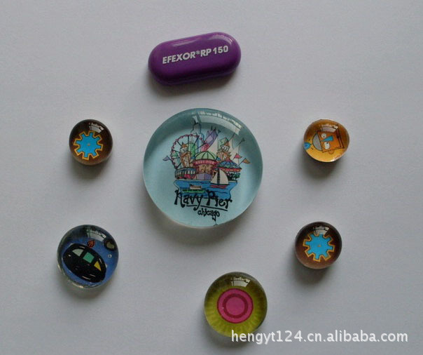 11)玻璃冰箱贴:采用下面软胶磁铁+上面铜版纸彩色印刷+半圆玻璃窗腹膜制作而成