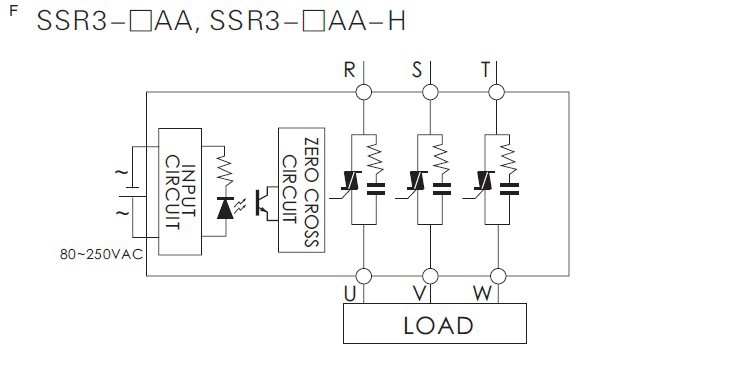 输入规格:动作电压 80~250VAC 50/60Hz; 触发电流 15mA/110VAC max; 控制方式 零电压触发