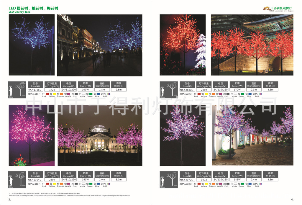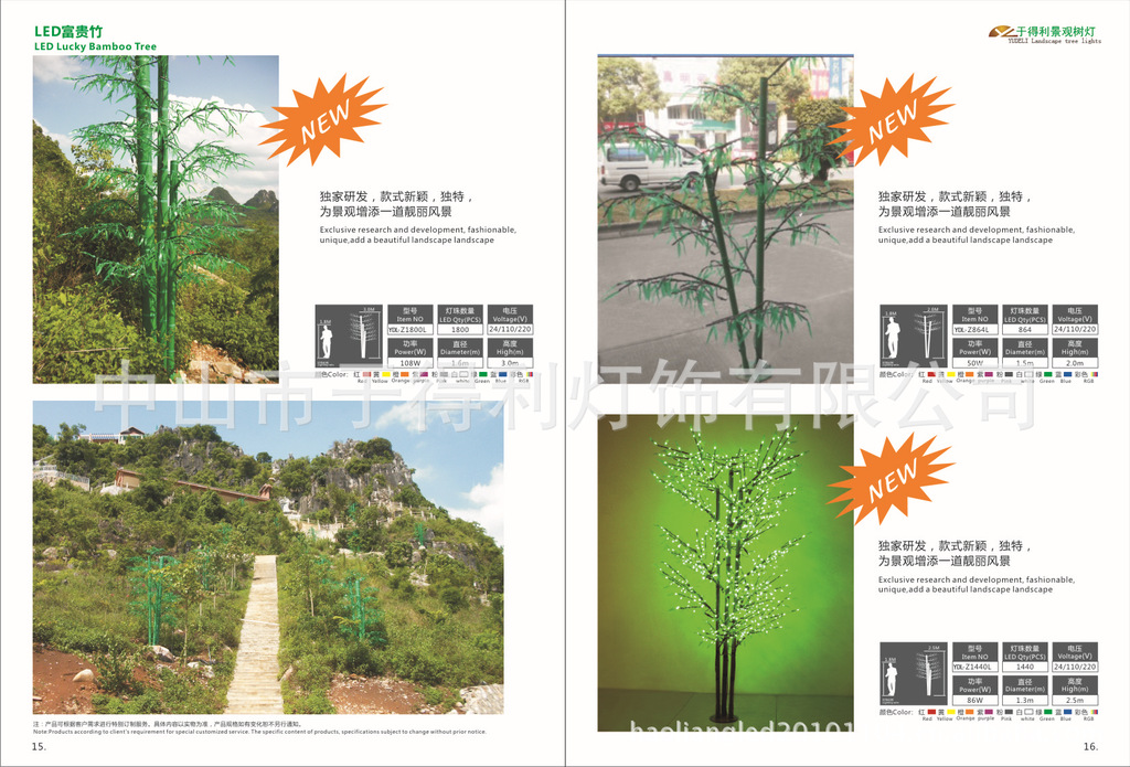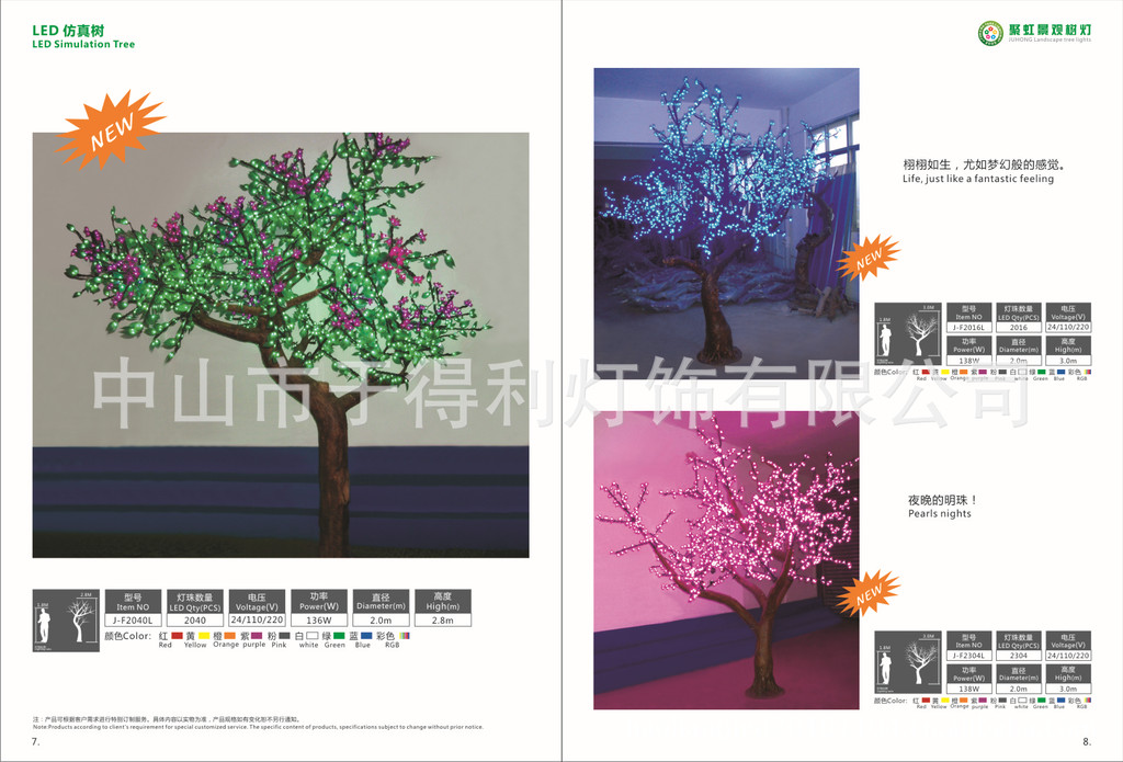 树的主杆为钢管,树枝为钢管或钢筋,外包仿真书皮.均采用高硬度,抗老化环抱材质,叶片为柔性抗老化材质,光源为LED颗粒灯,均做防水处理,低压低耗寿命长。