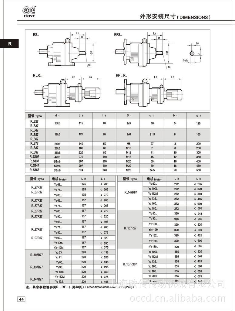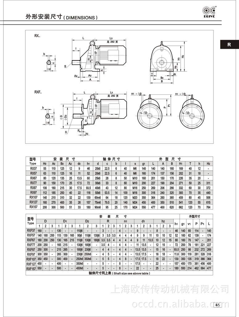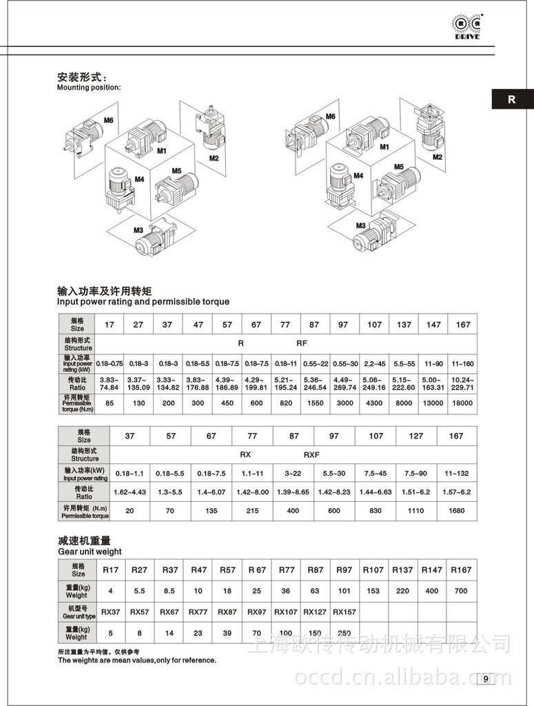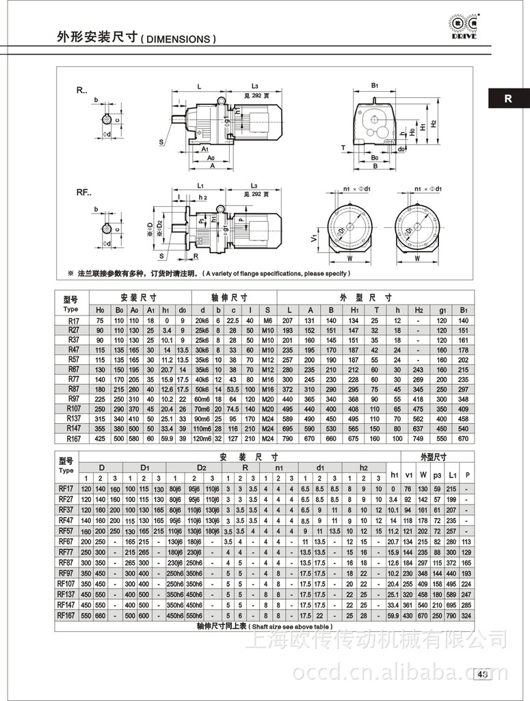上海欧传传动机械有限公司是专业研发、制造各类减速机、行星减速机、齿轮减速机、摆线减速机、蜗轮蜗杆减速机、圆柱齿轮箱、精密行星减速机等传动设备的厂家。 R型号代码: R17-Y0.25-4P-32.40-M1-0°-A R系列斜齿轮减速机性能特点: 1、产品噪音低,节能高,振动小;2、选用优质锻钢材料,钢性铸铁箱体,齿轮表面经过高频热处理;3、经过精密加工,确保轴平行度和定位轴承要求,形成斜齿轮传动总成的减速机配置了各种类电机,组合成机电一体化,完全保证了产品使用质量特性。4、结合国际技术要求制造,具有很高的科技含量5、节省空间,可靠耐用,承受过载能力高,功率可达160KW;6、能耗低,性能优越,减速机效率高达95%以上;7、R系列可承受较高的径向载荷。 结构形式:R轴伸式底脚安装;RF:法兰安装;R…F:底脚法兰安装;RM: 法兰安装带加长轴承箱;RX:单级底脚安装;RXF:单级法兰安装。