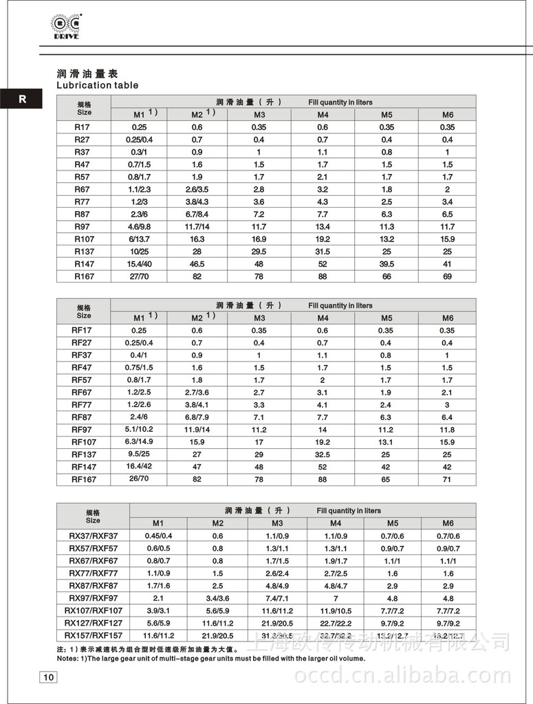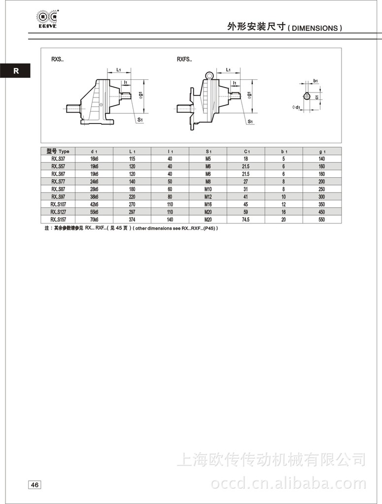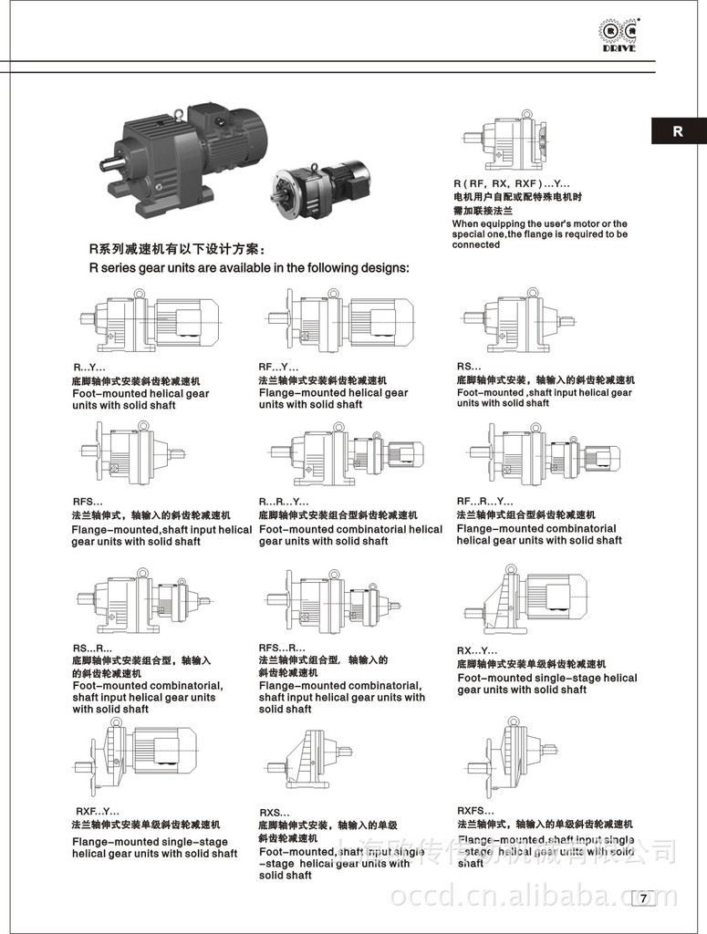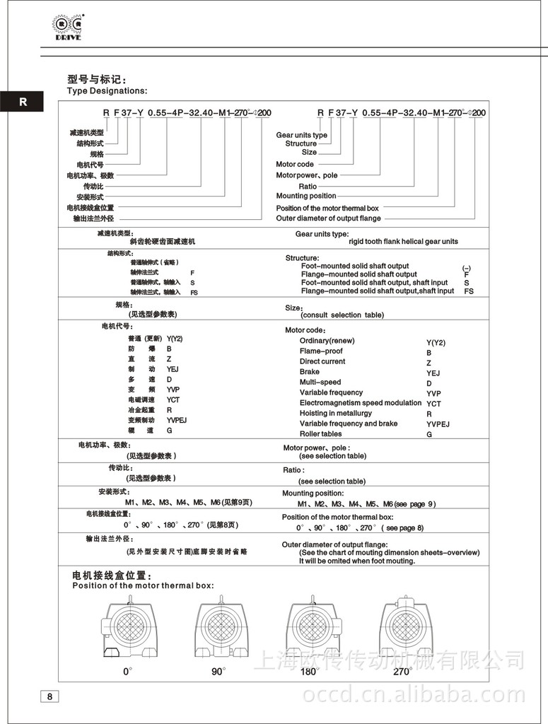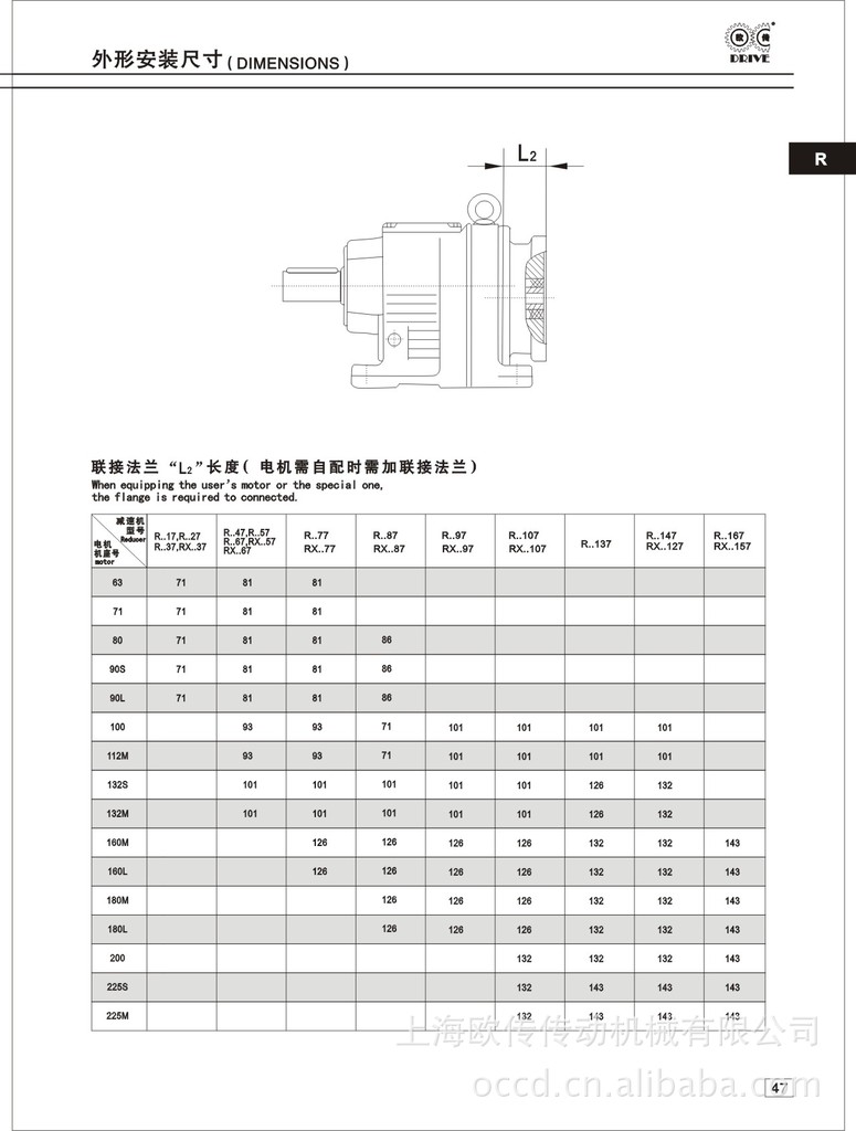 上海欧传传动机械有限公司是专业研发、制造各类减速机、行星减速机、齿轮减速机、摆线减速机、蜗轮蜗杆减速机、圆柱齿轮箱、精密行星减速机等传动设备的厂家。 R型号代码: R17-Y0.25-4P-32.40-M1-0°-A R系列斜齿轮减速机性能特点: 1、产品噪音低,节能高,振动小;2、选用优质锻钢材料,钢性铸铁箱体,齿轮表面经过高频热处理;3、经过精密加工,确保轴平行度和定位轴承要求,形成斜齿轮传动总成的减速机配置了各种类电机,组合成机电一体化,完全保证了产品使用质量特性。4、结合国际技术要求制造,具有很高的科技含量5、节省空间,可靠耐用,承受过载能力高,功率可达160KW;6、能耗低,性能优越,减速机效率高达95%以上;7、R系列可承受较高的径向载荷。 结构形式:R轴伸式底脚安装;RF:法兰安装;R…F:底脚法兰安装;RM: 法兰安装带加长轴承箱;RX:单级底脚安装;RXF:单级法兰安装。