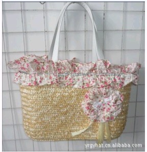 1、天然麦草编织上色而成,包包上配一朵粉红的花朵,突显时尚个性