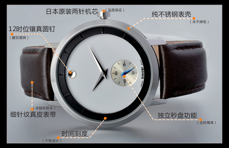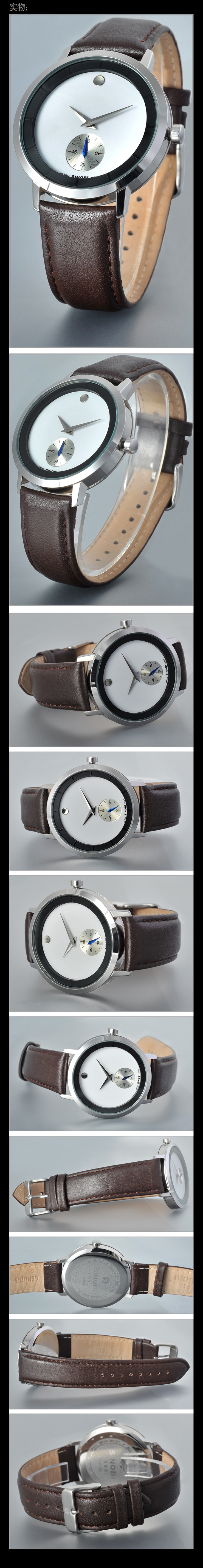 表圈又层防水设计,平面防刮高硬度钢化玻璃,内部经防反光处理,精钢表壳,真皮表带,黑/白/两色表盘