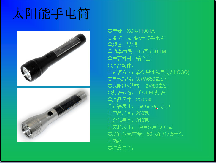 产品介绍太阳能手电筒是采用太阳能技术与节能LED完美结合的产物;外观精致功能方便实用;白天放到太阳底下晒晒,晚上就可以用几个小时,不需要更换电池,不会造成环境污染;是真正的低碳环保绿色产品。适用范围 适用于家庭或户外照明,狩猎者,徒步旅行者和露营者,军事,警卫,交通勘查和从事紧急情况的工作 方便于缺电、少电地区旅游、礼品赠送等。不需要任何电源补充,采用太阳光和灯光, 蓄电备用。工作原理 太阳能手电工作原理:先采集光线,将光能转换为电能。并由安定器转变,带动LED发光