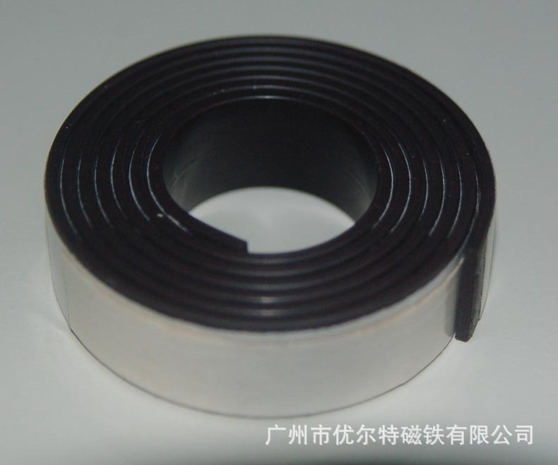 橡胶磁体由磁粉(SrO6Fe2O3)、聚乙烯(CPE)和其它添加剂(EBSO、DOP)等组成,通过挤出、压延制造而成。橡胶磁材可以是同性的或异性的,它由铁氧体磁粉、CPE和某些微量元素制成,可弯、可捻、可卷。它无需更多机械加工即可使用,也可以按所需尺寸修整形状,橡胶磁也可以根据客户要求复PVC,背胶,上UV油等。它的磁能积在0.60至1.50 MGOe之间。