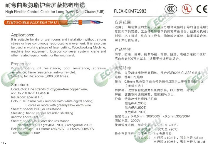 产品特性:防水、防油、耐寒、阻燃,电磁屏蔽抗干扰好弯曲寿命500万次以上,适用于快速移动场合。