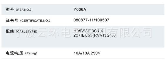 宁波云环电子集团有限公司创建于1985年,在电气行业中实力雄厚,专业生产电源线、橡胶线、插头、插座、灯具、线束、电脑周边连接器、通讯连接器、DC电源线、音视频连接器等