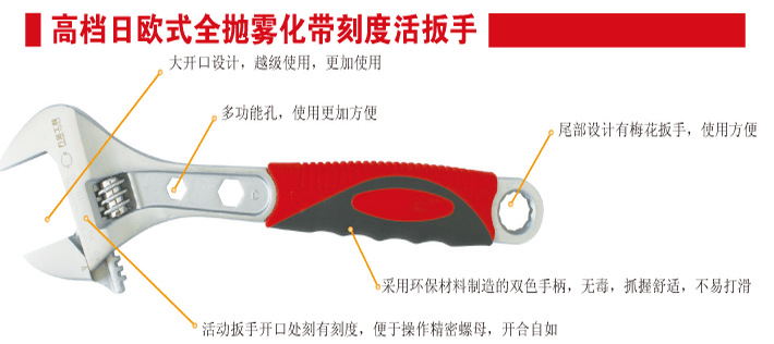 供应 扳手类手动工具 双色手柄 高档日欧全抛雾化带刻度活扳手