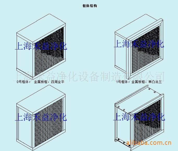 外框:铝合金型材/镀锌钢板/木框/不锈钢板 隔板:铝箔/纸质 滤料:玻纤过滤纸 效率:99.99%/99.97%at0.3um 另有亚高效、中效可供选择