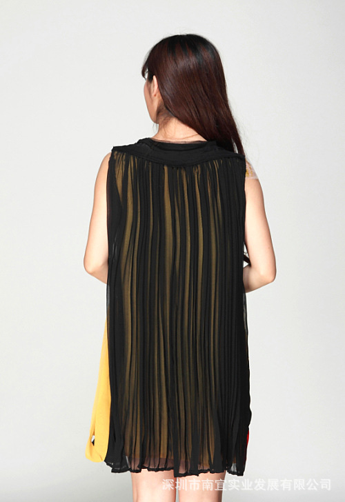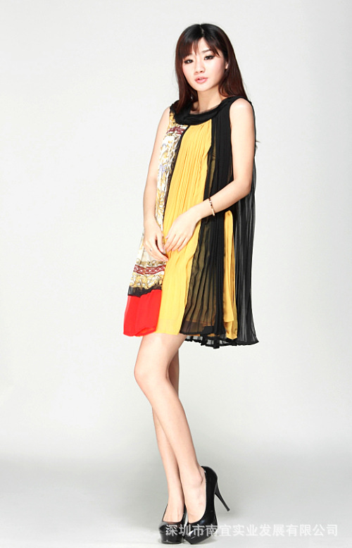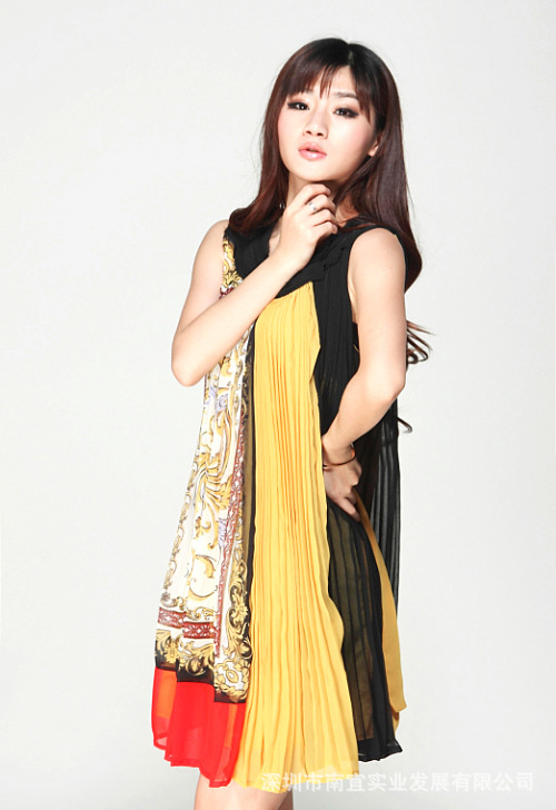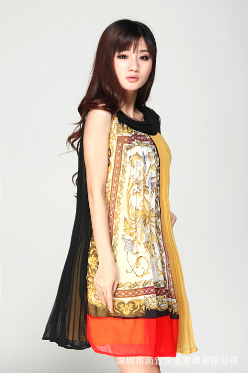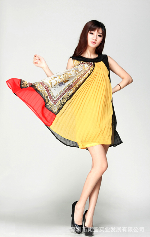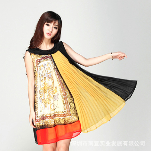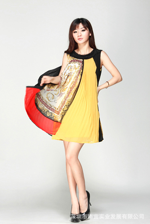2012春夏新款立体印花压褶大摆连衣裙配腰带