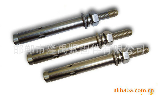 使用时,须先用冲击电钻(锤)在固定体上钻出相应尺寸的孔,再把螺栓、胀管装入孔中,旋紧螺母即可使螺栓、胀管、安装件与固定体之间胀紧成为一体。拧紧以后会膨胀的,螺栓尾部有一个大头,螺栓外面套一个比螺栓直径稍大的圆管子,尾部那部分有几道开口,当螺栓拧紧以后,大头的尾部就被带到开口的管子里面,把管子冲大,达到膨胀的目的,进而把螺栓固定在地面或墙壁上,达到生根的目的。