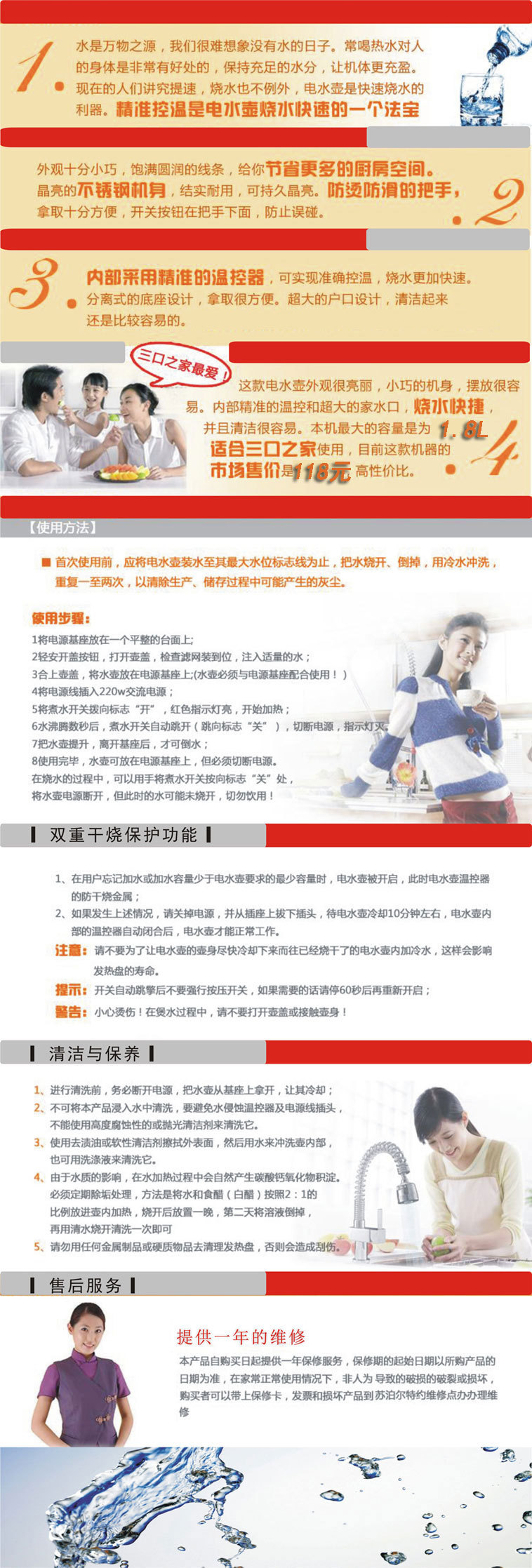 1:全自动快速烧开水:采用优质全自动组合式温控器,安全耐用