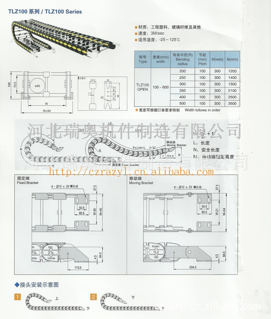 承重超长型铝合金塑料拖链是我公司新研制开发并生产的一种新型拖链,它的侧片是由增强尼龙P12构成,支撑板是加厚铝合金,它的优点是支撑能力超过塑料拖链,重量轻于钢制拖链,运动速度快。