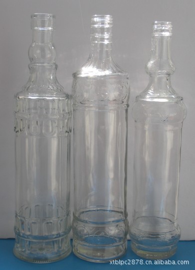 这3款洋酒瓶瓶身各具花纹 造型精致 左侧一款容量720ml 高度31cm 瓶身直径7.6cm 口径3.1cm 自重600g; 中间一款容量750ml 高度31cm 瓶身直径7.2cm 口径2.8cm 自重600g; 右侧一款容量 500ml 高度30.5cm 瓶身直径6cm 口径2.6cm 自重450g。