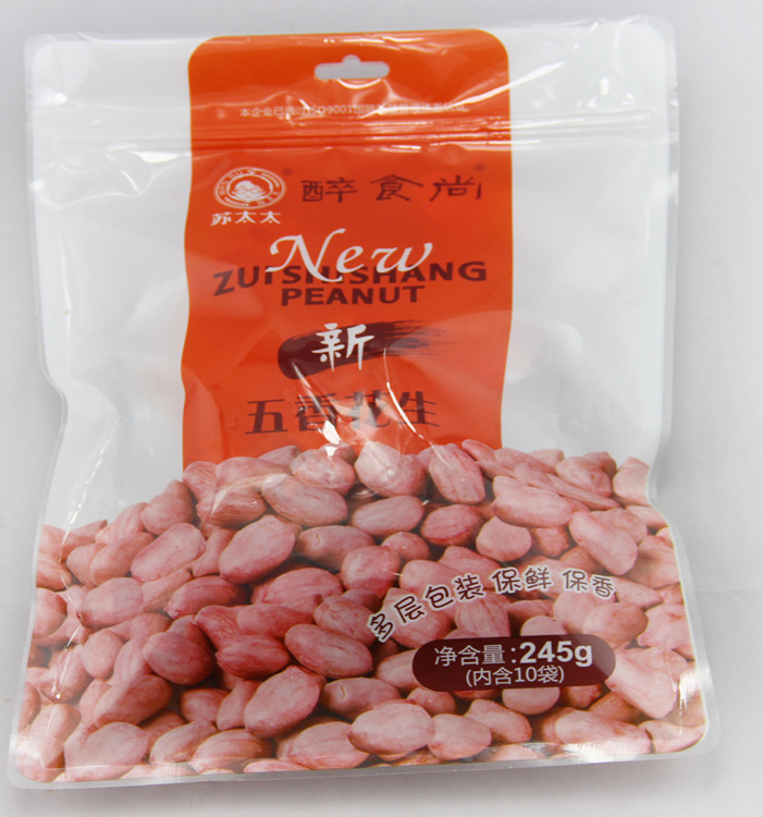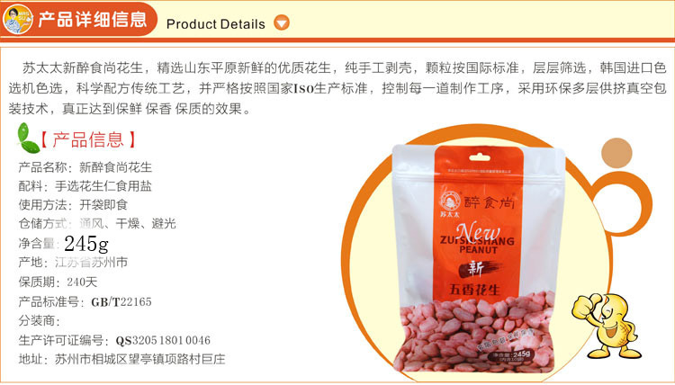我们的产品原料采用山东平原新鲜的花生,颗颗饱满,粒粒均匀,经过手工剥壳,层层挑选,把形状不规则、霉变、芽头、杂质去掉,颜色采用韩国色选机色选,加上苏太太食品公司的科学的配方传统的制作工艺,并严格按照国家QS生产标准,控制每一道制作工序,采用9层共挤包装真空保鲜,真正达到240天保质期,保证了苏太太新醉食尚五香花生米三保的优良品质(保鲜 保香 保质)。口味真正独特纯正,回味香酥可口,深得20-45岁成功人士的青睐和厚爱。