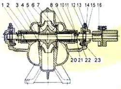 1、泵体 2、泵盖 3、叶轮 4、轴 5、双吸密封环 6、轴套 7、填料套 8、填料 9、填料环 10、填料压盖11、轴套螺母 12、轴承体13、固定螺丝 14、轴承体压盖15、单列向心球轴承 16、联轴器部件17、轴承端盖 18、挡水圈