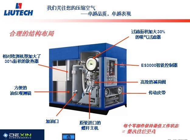 先进的PLC控制器可设定各种保养计划,并及时提示,提高压缩机的使用率。独特的油气分离器铰链盖板设计,方便操作,安全性高。