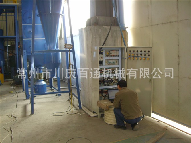 气力回收式喷砂房主要由房体、喷砂设备、磨料回收装置、通风除尘装置、磨料分选装置和电控装置组成。为了简化设备,可以将磨料回收和通风除尘两部分合并。风机通过蜂窝地板将磨料、粉尘、气流全部吸到磨料集中过滤器。含粉尘的气体经过滤器过滤,粉尘附着在过滤器外壁,干净气体则穿过过滤器一部分排出到厂房外,一部分循环到喷砂房内。磨料及重的粉尘继续经过磨料槽到分选器。分选器为一内外锥体结构, 内外锥体之间有一可以调节的通道。通过调节芯体,可以改变气流通道截面,从而调节分离比例。分离过程为: 当磨料和粉尘通过通道时,由于重力的作用,粉尘和气体向上通过锥体之间的缝隙出来,而磨料与粗颗粒则掉到锥体下面的振动筛。振动筛进一步将磨料和粗颗粒分离,分离出来的纯净磨料通过筛孔进入指定料斗到喷砂罐再循环使用。通过分选器的粉尘与气体再经过一个过滤器过滤,干净的气体排出厂房外,粉尘则落入废料斗。