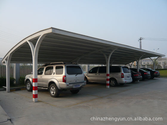 分为单式车棚和复式车棚。单式车棚底座一般有两根钢架;复式车棚则根据所停车辆情况决定。而小型车棚的棚架由2-5根钢架组成,大中型则是由6-10根甚至更多组成。