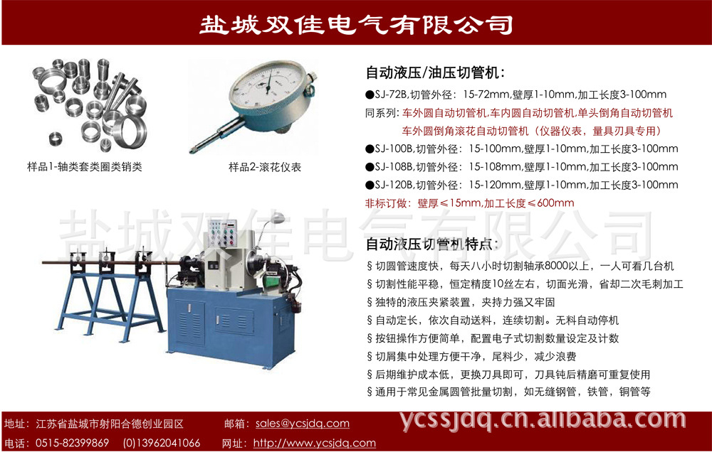 双佳电气致力于高质高效的管件批量车加工自动化设备生产。生产的自动液压切管机一次上料,自动进料,自动切割,自动下料,自动化程度高。与其他自动化切管设备比较,优越性如下:比仪表车省钱,比锯床快,比气动切管机稳定,比金属圆锯机精度高,为综合性能最高,性价比最好的全自动切管设备。自动切管机可附加车外圆,车孔,单头倒角,滚花等各种功能。一机多用,一人多机操作,适用于金属圆管类、汽摩零配件、仪器仪表、量具刃具、机械五金等批量车加工。双佳电气还提供单头倒角机、双头倒角机及倒角、沟槽、车内孔、外径、企口生产流水线等全自动化设备。联系人:王经理,联系电话:(0)13962041066,0515-82399869。
